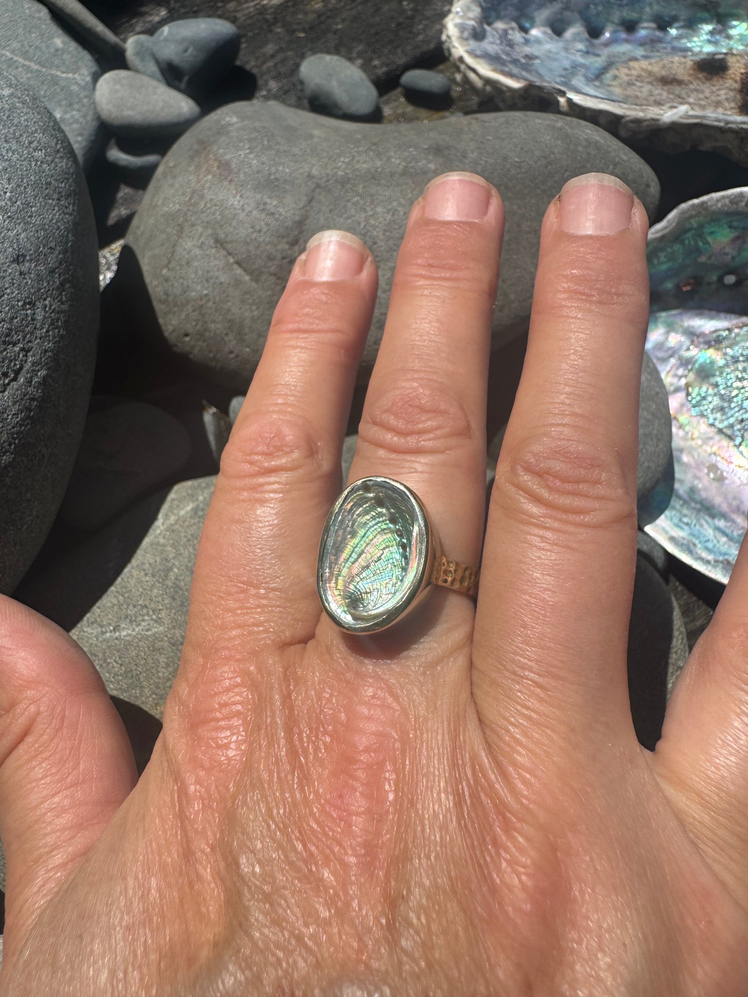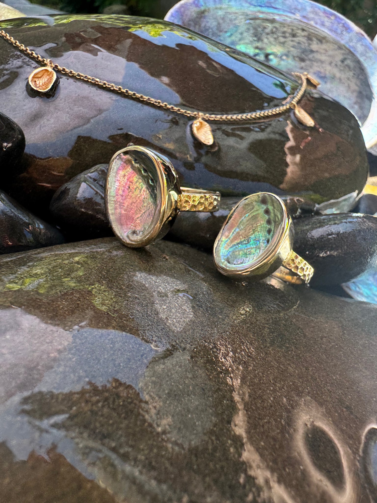 Set with a sustainably sourced whole baby New Zealand Blue Pāua shell, each ring carries the unique colours, textures, and tides of the moana. Because pāua is a natural material, every shell has its own character and may differ slightly from the photos.
