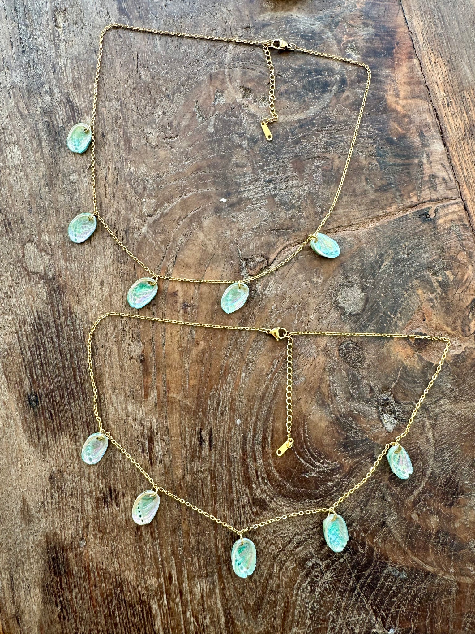 Delicate and enchanting, this necklace features five whole baby pāua shells strung on sterling silver or gold plated tarnish resistant PVD, each one shimmering with natural iridescence in hues of blue, green, and violet. Inspired by the quiet magic of the ocean, it’s for those drawn to be next to, in, or on the sea. A wearable treasure that captures the mystery, strength, and elegance of the ocean floor.